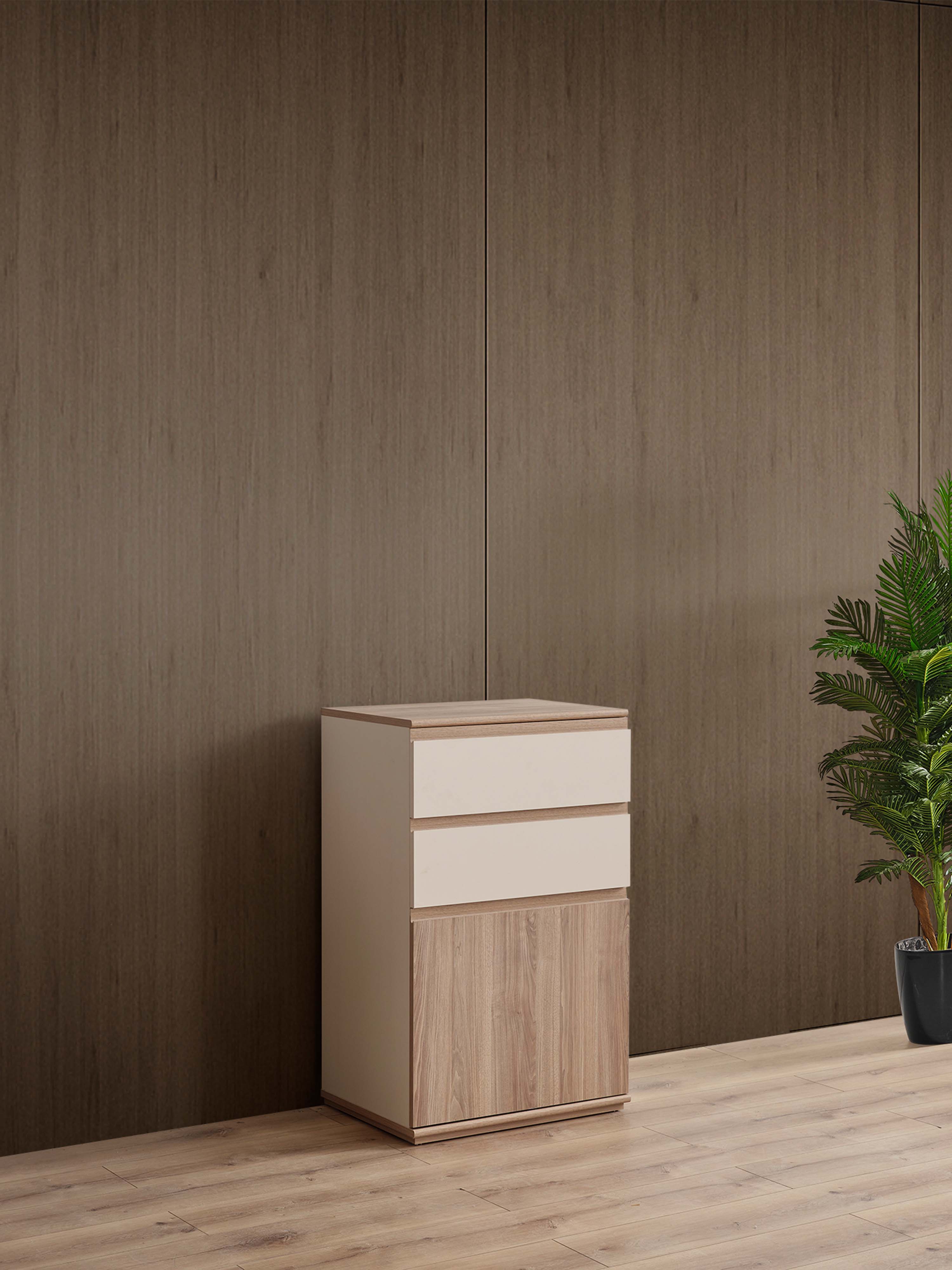 - Stauraum: Zwei Schubladen und ein geräumiges Fach mit Tür für vielseitige Aufbewahrungsmöglichkeiten