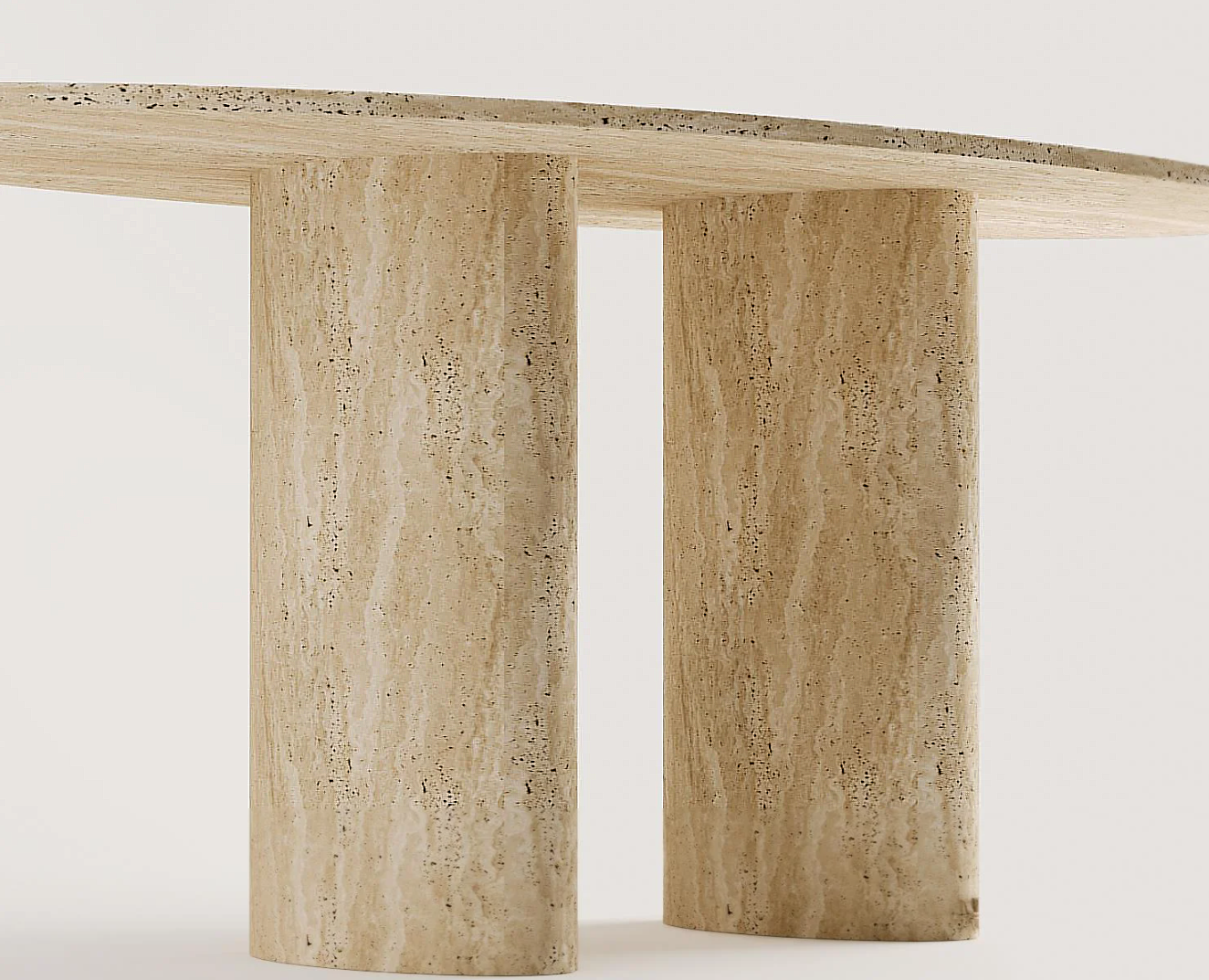 Gefertigt aus echtem Travertin, zeichnet sich der Tisch durch seine einzigartige Struktur aus. Jeder Stein besitzt individuelle Farbnuancen, Adern und kleine Poren, die den authentischen Charakter des Natursteins unterstreichen. Die Oberfläche ist matt und kann auf Wunsch auch poliert oder mit verschlossenen Poren geliefert werden.