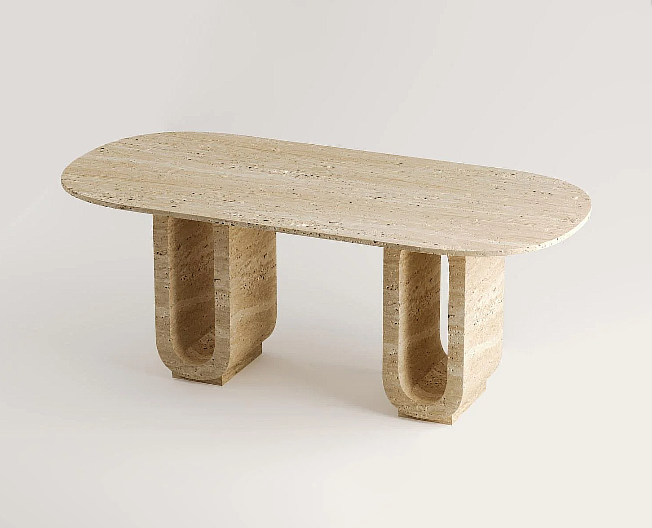 Der Deduce Travertin Esstisch beeindruckt mit einer rechteckigen Tischplatte und einer klaren, geradlinigen Formgebung. Das reduzierte, moderne Design hebt die natürliche Eleganz des Steins hervor und macht den Tisch zu einem stilvollen Mittelpunkt im Essbereich.