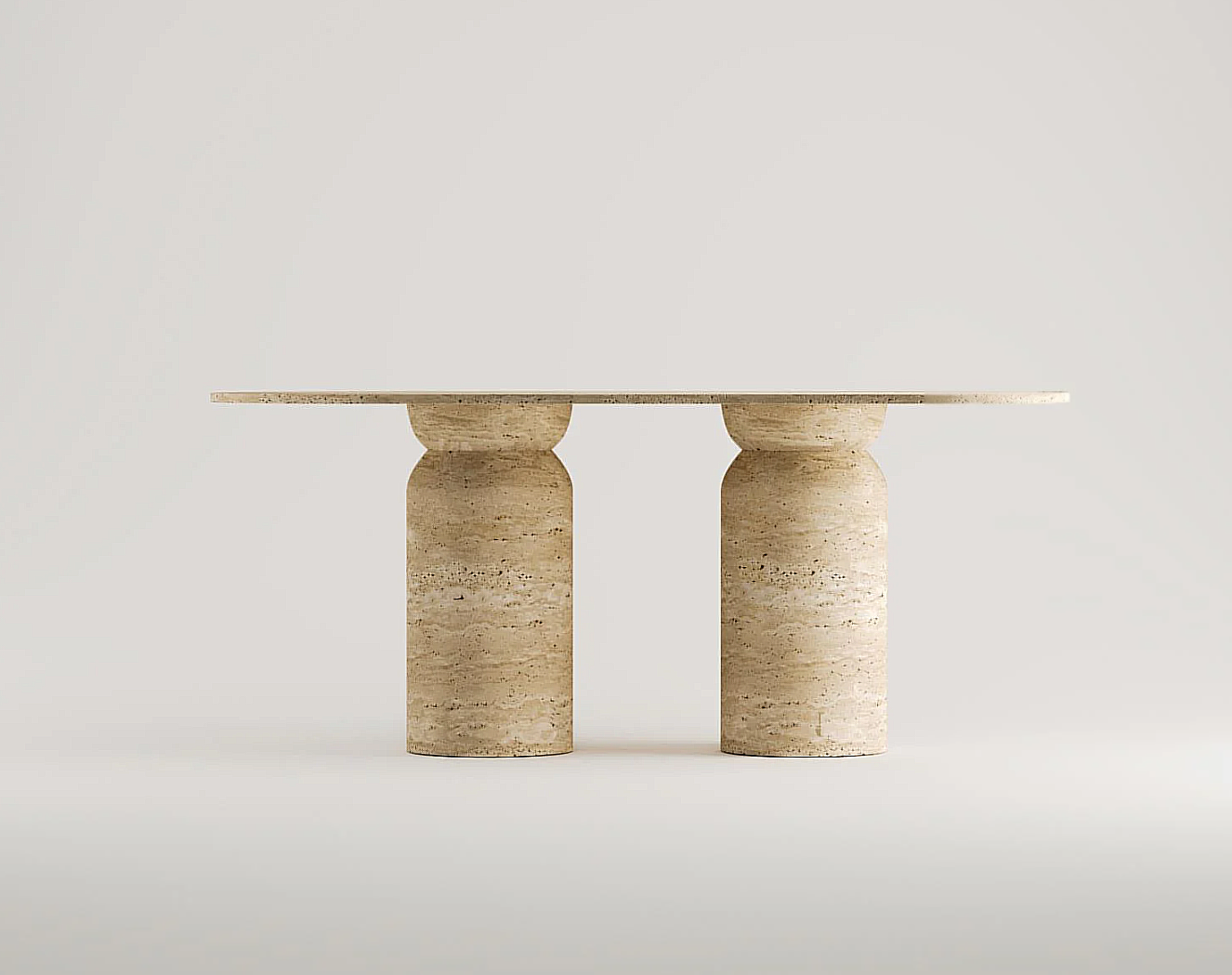 Der Joyce Travertin Esstisch präsentiert sich mit einer großzügigen, rechteckigen Tischplatte und einem klaren, modernen Design. Die reduzierte Formensprache betont die natürliche Schönheit des Steins und macht den Tisch zu einem stilvollen Mittelpunkt im Essbereich.