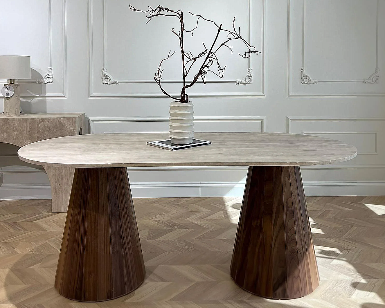 Der Martha Travertin Esstisch kombiniert eine rechteckige Tischplatte aus Naturstein mit einem konisch geformten Mittelfuß aus Holz. Diese Verbindung von Stein und Holz schafft einen spannenden Materialkontrast und macht den Tisch zu einem eleganten Blickfang im Essbereich.