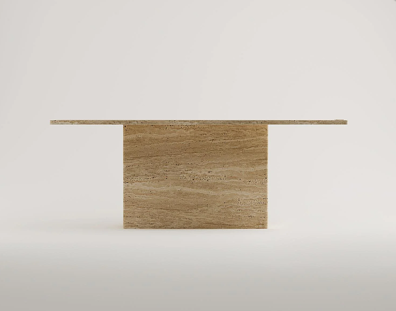 Gefertigt aus echtem Travertin, zeichnet sich der Tisch durch seine natürliche Struktur aus. Jeder Stein ist ein Unikat mit individuellen Farbverläufen, Adern und feinen Poren. Die matte Oberfläche unterstreicht den authentischen Charakter.