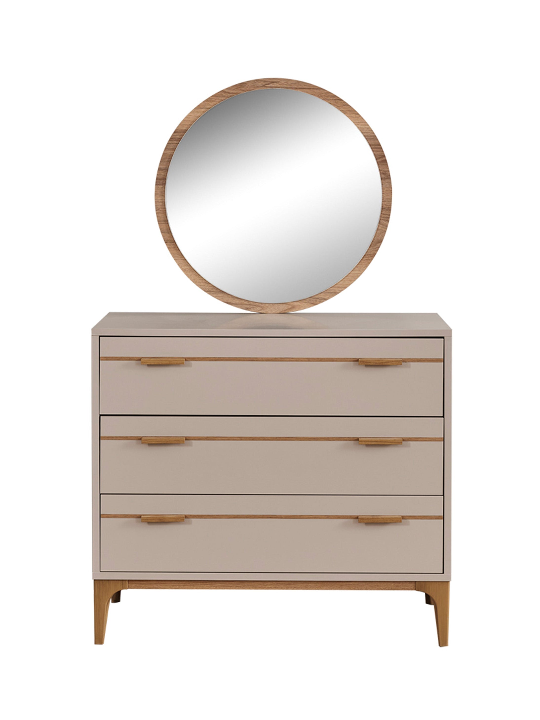 Die Nova Kommode vereint modernes Design mit funktionaler Aufbewahrung. Mit ihren drei geräumigen Schubladen, stilvollen Holzgriffen und dem optionalen runden Spiegel ist sie die perfekte Ergänzung für dein Schlafzimmer, Wohnzimmer oder den Flur.