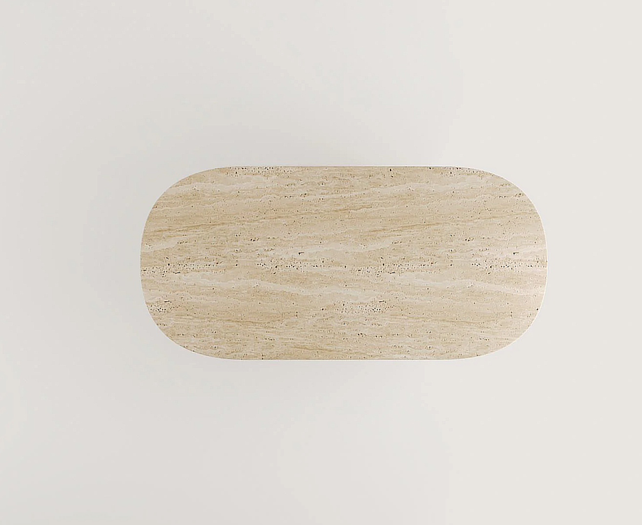 Der Pera Travertin Esstisch überzeugt mit einer ovalen Tischplatte und klarer, eleganter Formensprache. Das zeitlose Design bringt die natürliche Schönheit des Steins zur Geltung und macht den Tisch zu einem stilvollen Mittelpunkt im Essbereich.