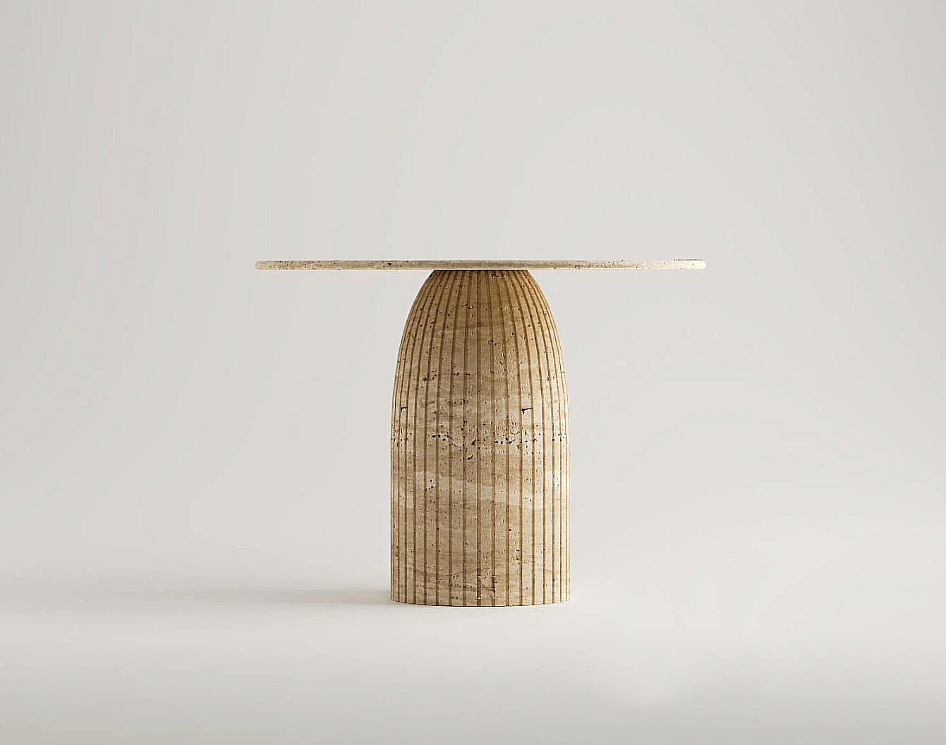 Ein runder Esstisch aus natürlichem Travertin, der durch seine klare Formensprache und die elegante Maserung des Steins eine zeitlose Ausstrahlung besitzt. Ideal für stilvolle Essbereiche, die Natürlichkeit und Eleganz vereinen.