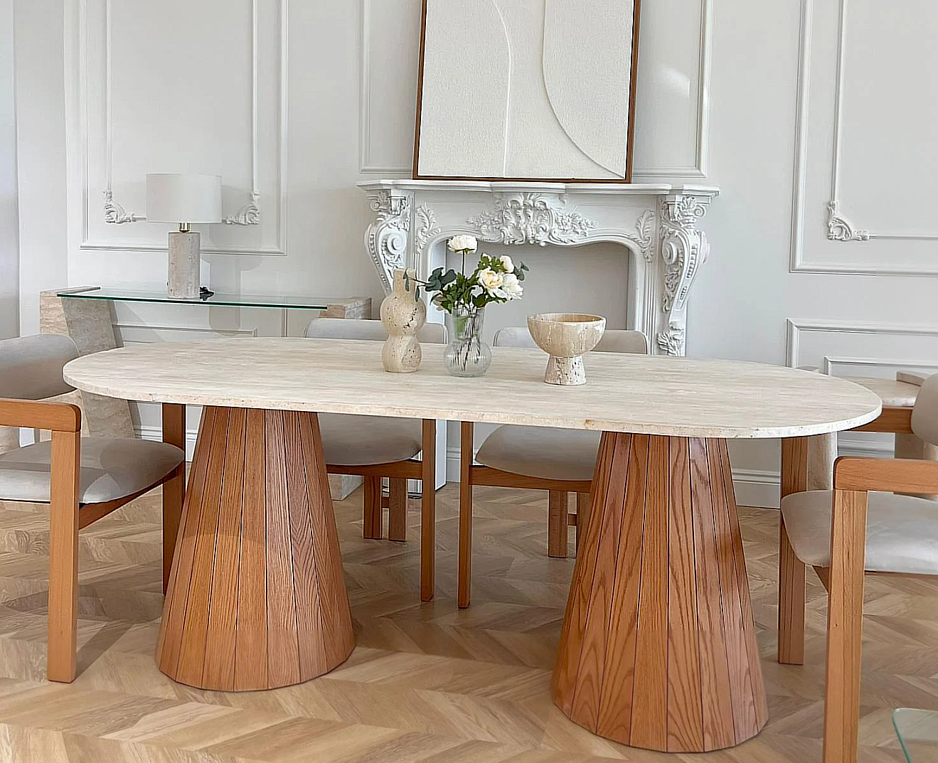 Der Yuvve Esstisch verbindet eine rechteckige Tischplatte aus Travertin mit einem konisch geformten Fuß aus Holz. Dieses Zusammenspiel von Naturstein und Holz schafft eine harmonische Balance zwischen Robustheit und Wärme und macht den Tisch zu einem stilvollen Mittelpunkt des Essbereichs.