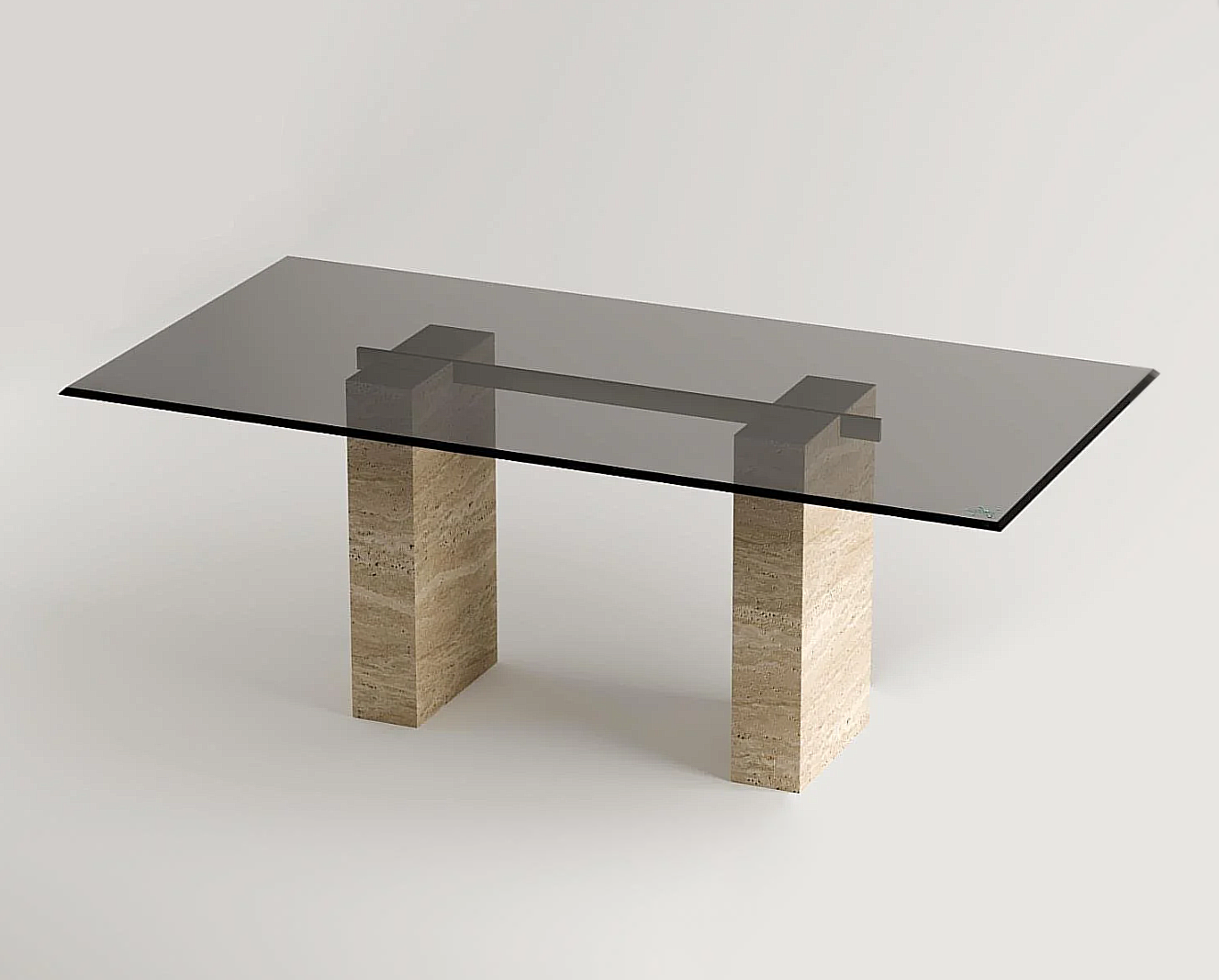Der Sahra Esstisch kombiniert eine elegante Glasplatte mit einem Travertin-Gestell. Das moderne Design verbindet Transparenz und Leichtigkeit mit der markanten Ausstrahlung von Naturstein und schafft so einen stilvollen Mittelpunkt im Essbereich.